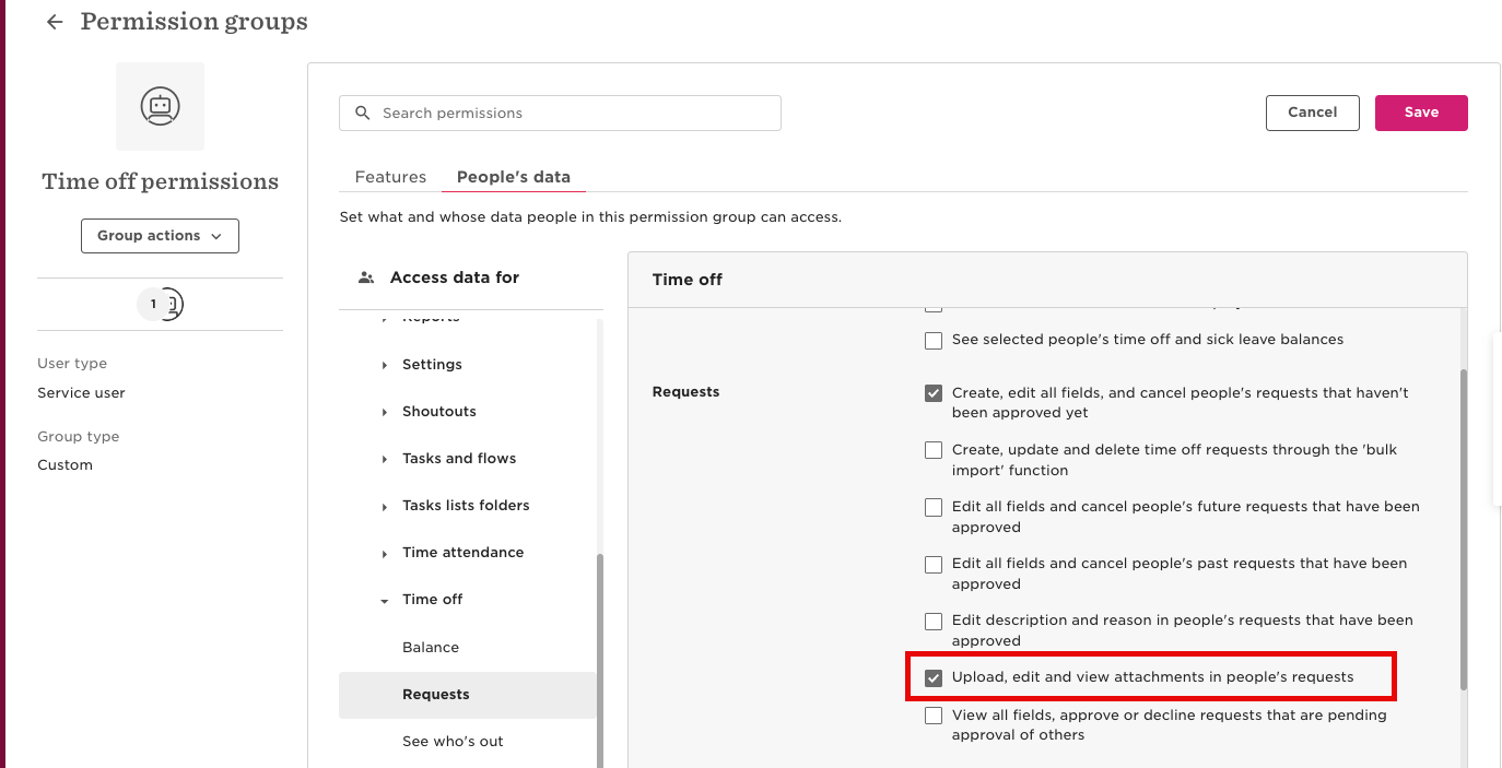 If your integration relies on access to attachments, make sure to grant your service user's permission group the following permission: People’s data > Time off > Requests > View, download, and edit attachments.